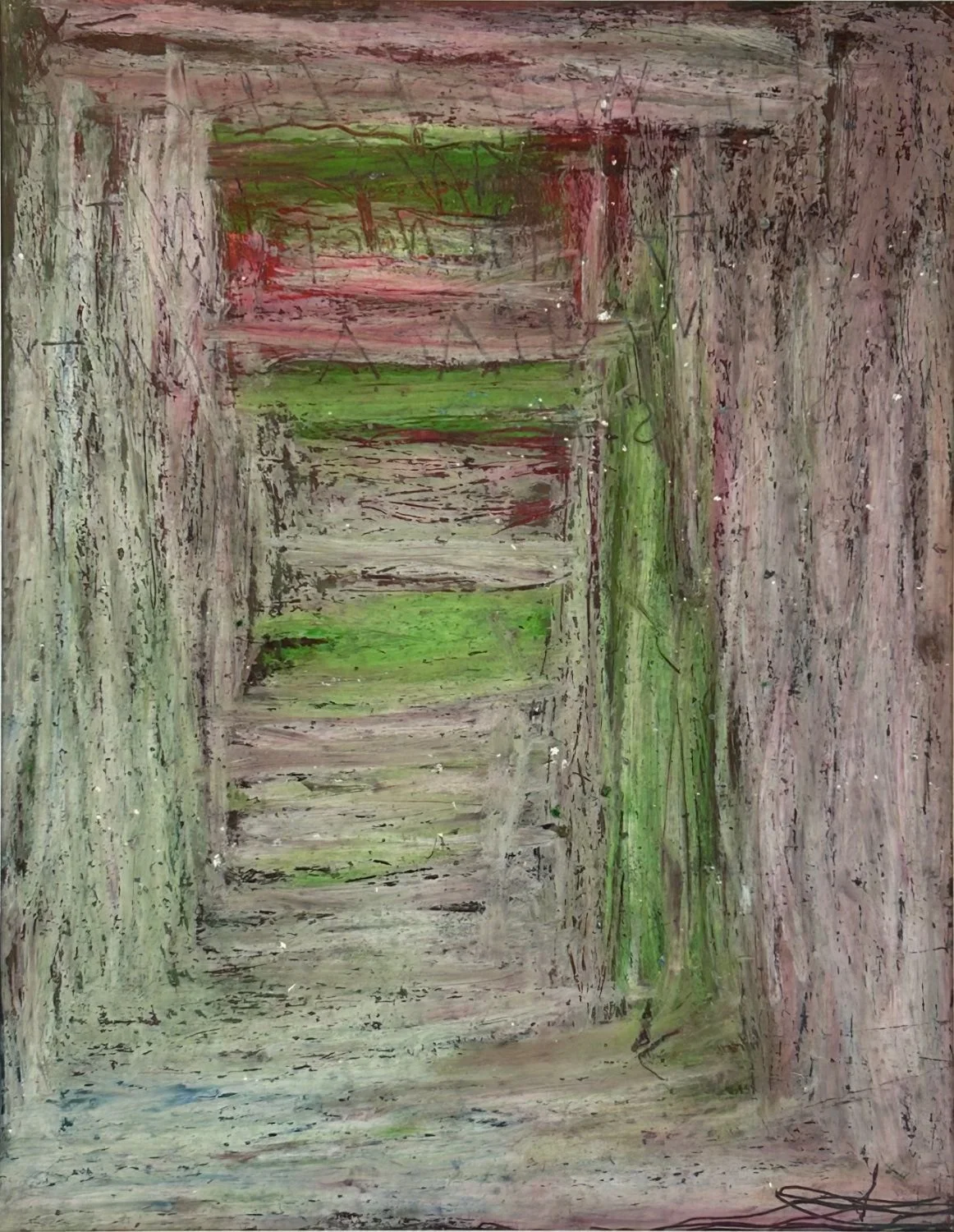 A recent transplant from SoCal, Patrick Dwyre joined Make Studio in Baltimore in 2024 and quickly showed how expertly he had honed his art practice during his prior tenure with Tierra del Sol in Sunland, CA. Patrick utilizes a distinct manner of thickly layering primarily pastels and woodless colored pencils, sometimes using strategic scraping to define expressive forms that are often depictions of architecture and places. He enjoys patiently “playing the long game” in his work, with extensive layer-upon-layer application.