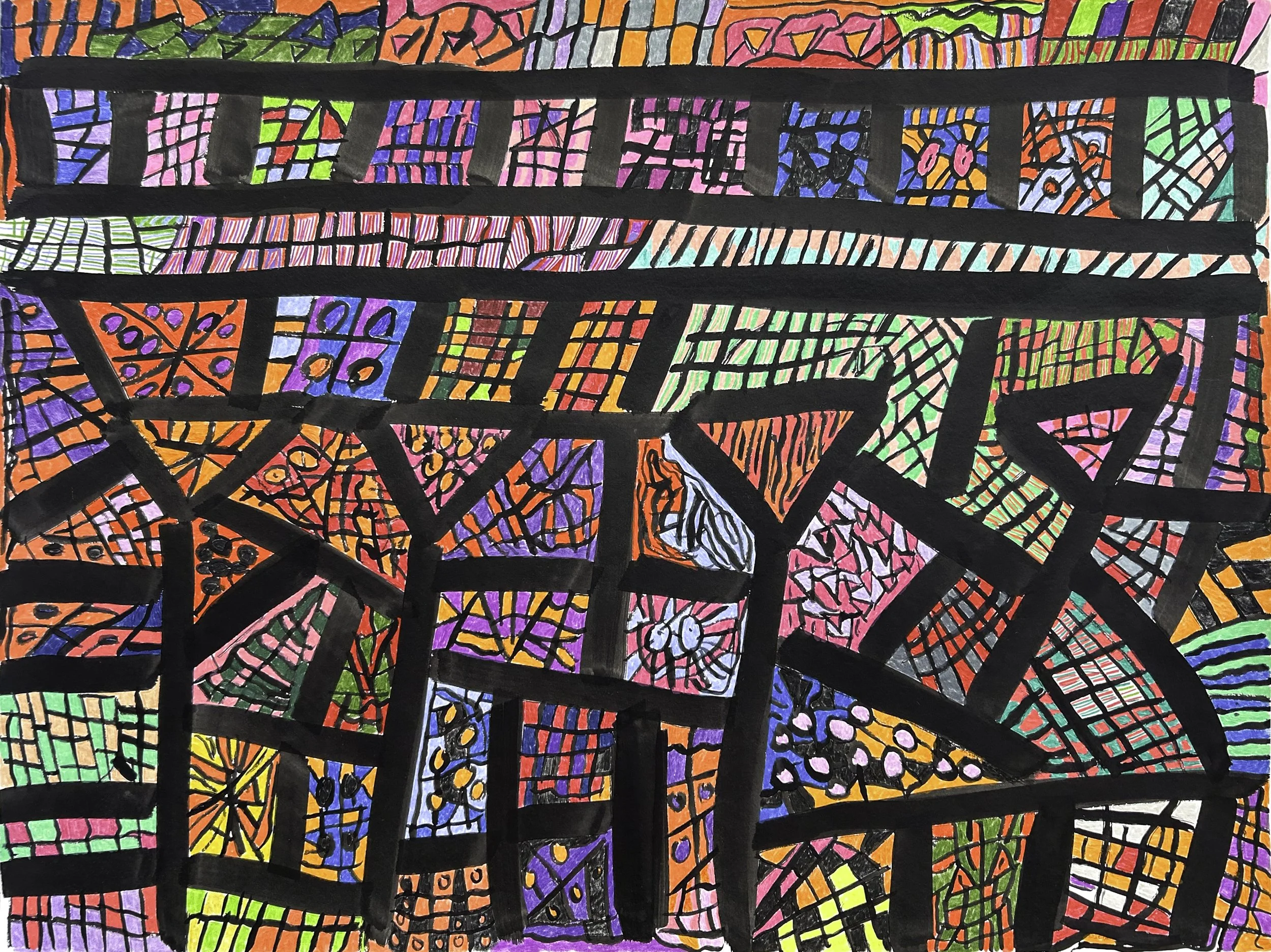Sherri is a Detroit based artist who works out of the PASC Detroit studio. When asked what inspires her artwork Sherrie says "I was born in Detroit, and my family is from here too. I like to work here because I was born here, and I live here. I've been drawing since I was little. I like to work with many colors. I draw lots of things, flowers, bubbles, faces and shapes. I create lots of things, and I just want to create more. I keep challenging myself to do things differently." Her work is intricate and detailed involving colorful shapes, symbols and text, integrated into her artworks, reminiscent landscapes or maps.